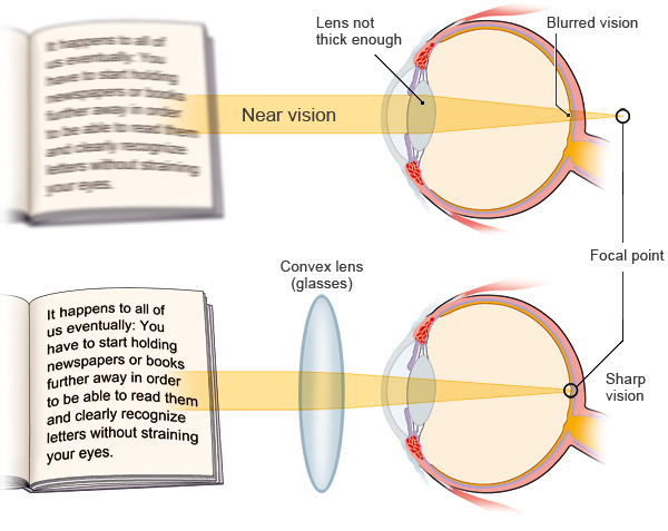 Presbyopia is caused by a hardening of the lens of your eye, which occurs with aging. As your lens becomes less flexible, it can no longer change shape to focus on close-up images. As a result, these images appear out of focus.